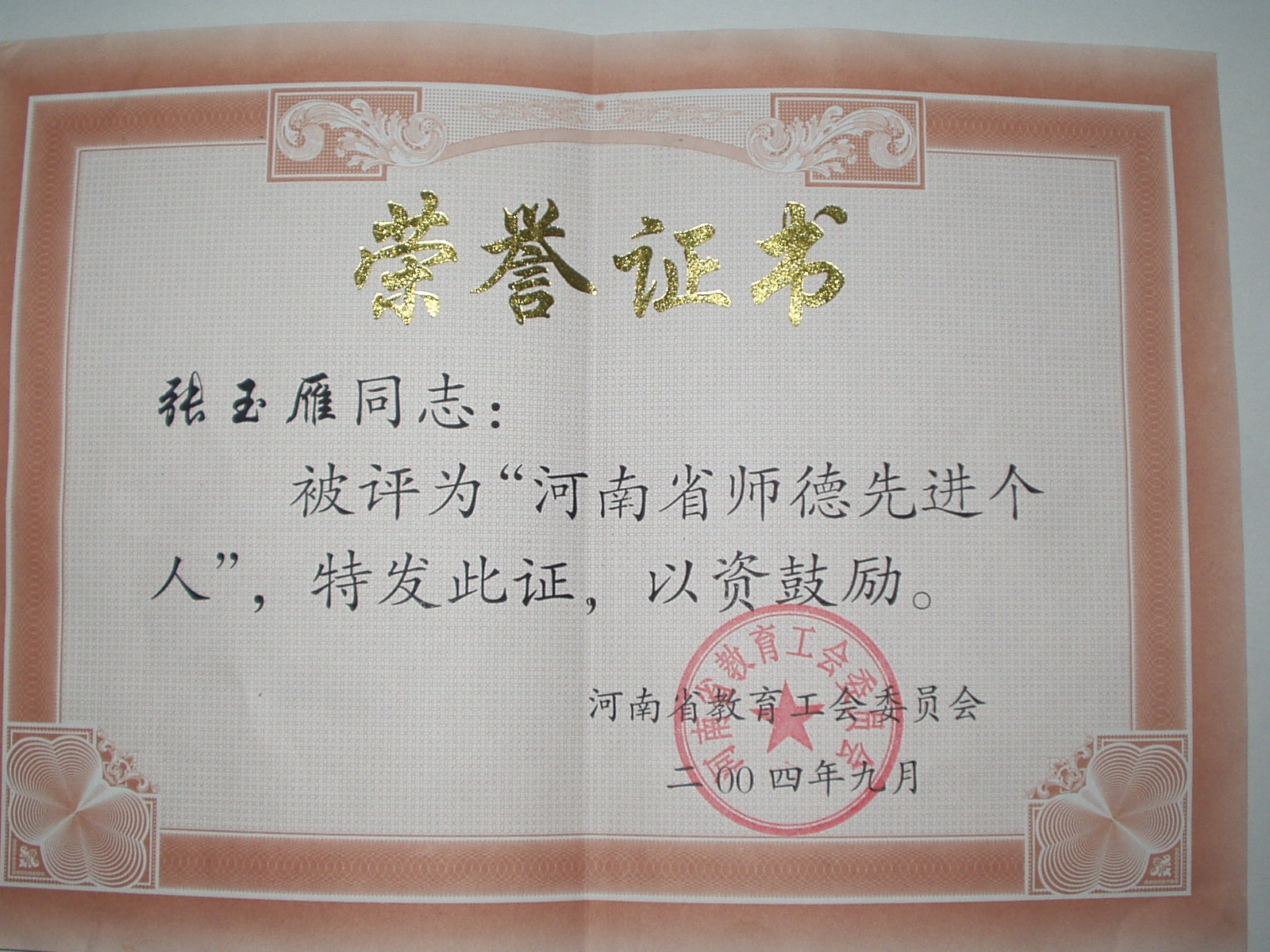 几年来,在平凡岗位上,踏实步履,实现着自己人格追求,实践着对党、对教育事业的忠诚。同时,也赢得了社会的赞誉,数次被评为省、市、校级先进。